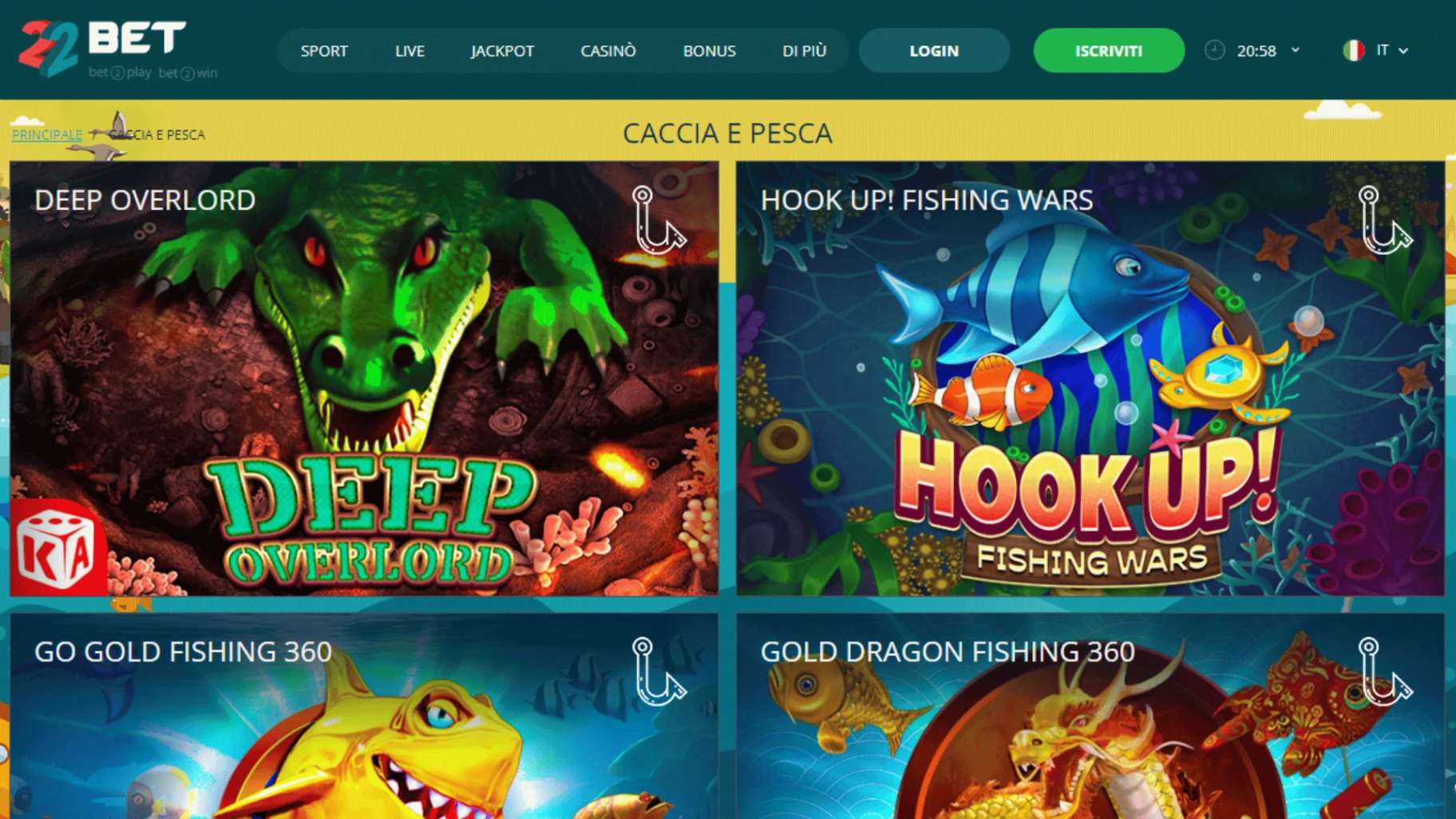 Ci sono tantissimi giochi di casino su 22Bet Italia. Tra questi abbiamo giochi con jackpot, giochi da tavolo, slot machine, casino live, tavoli di poker, stanze bingo, giochi TV, quick games, crash games e giochi di caccia e pesca.