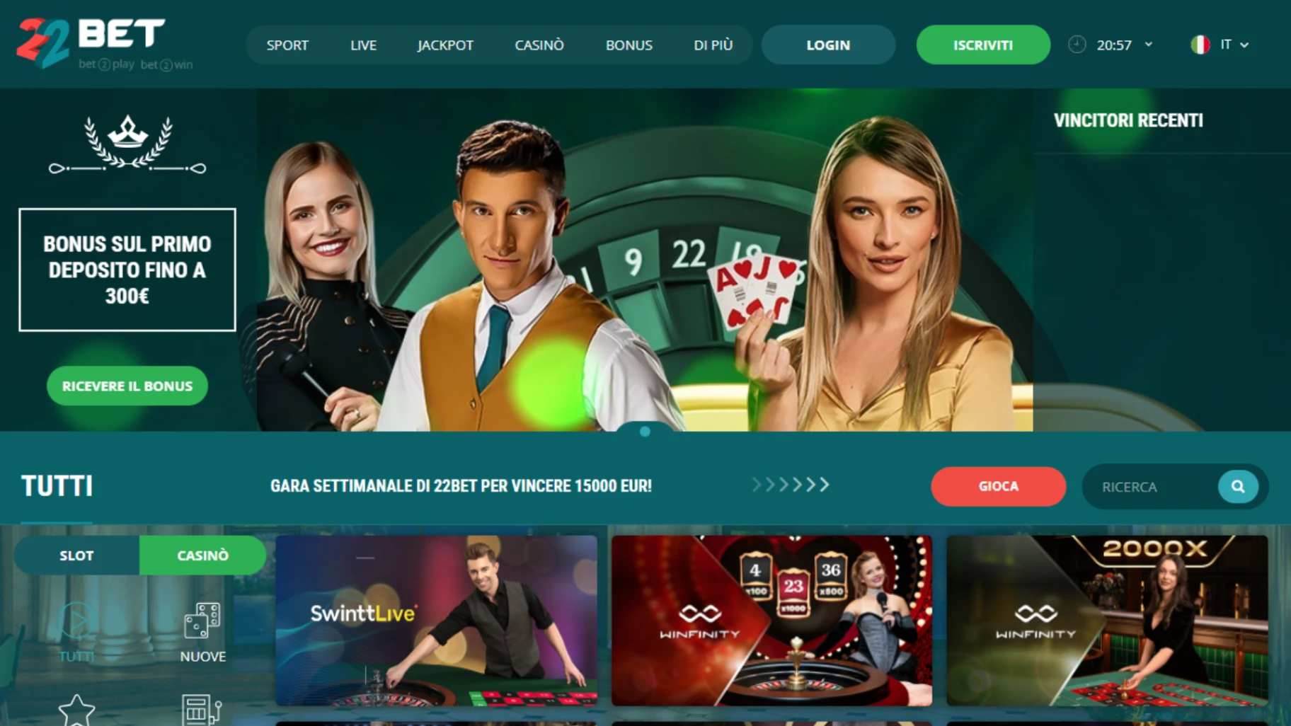 22Bet è uno dei casino più amati dai giocatori Italiani. Si tratta di uno dei casino non AAMS con il maggior numero di connazionali iscritti e con una selezione di giochi immensa. Insomma, parliamo di un casino online di un “certo peso”, rinomato in tutto il mondo.